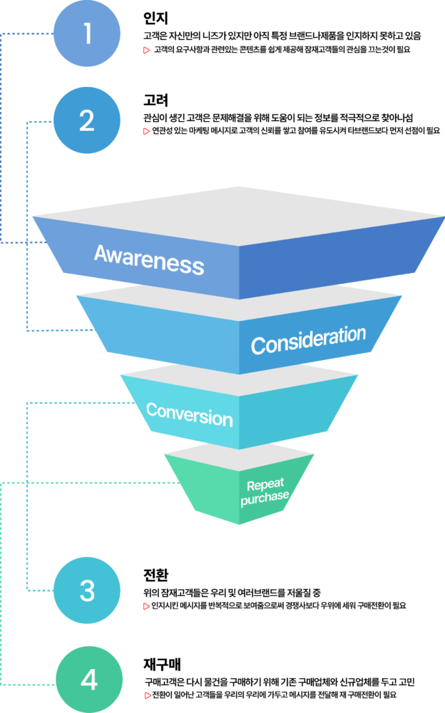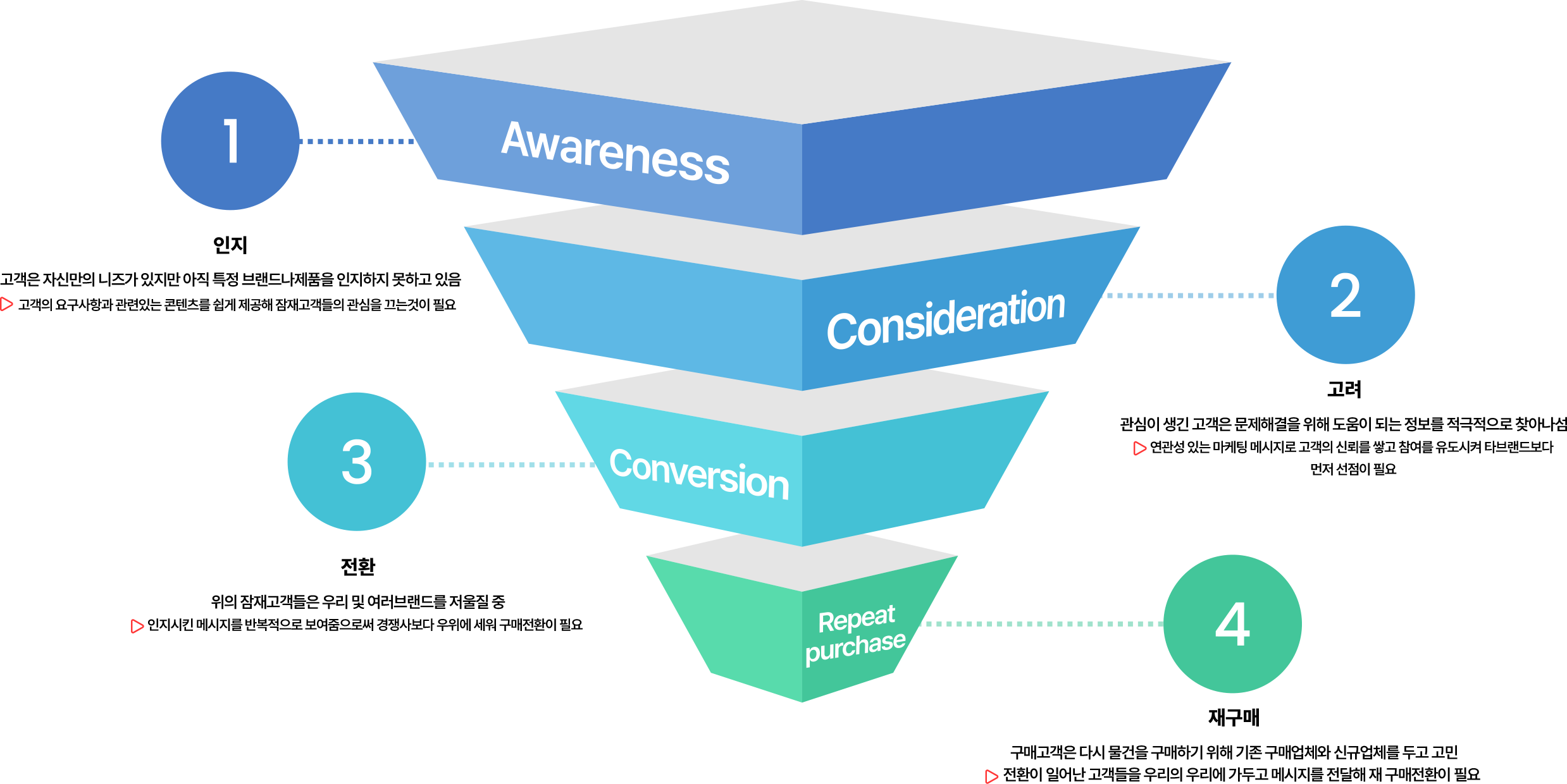 Customer journey 전 과정에서 데이터 기반의디지털 기술을 활용한 Full funnel marketing을 설계하고 실행합니다.